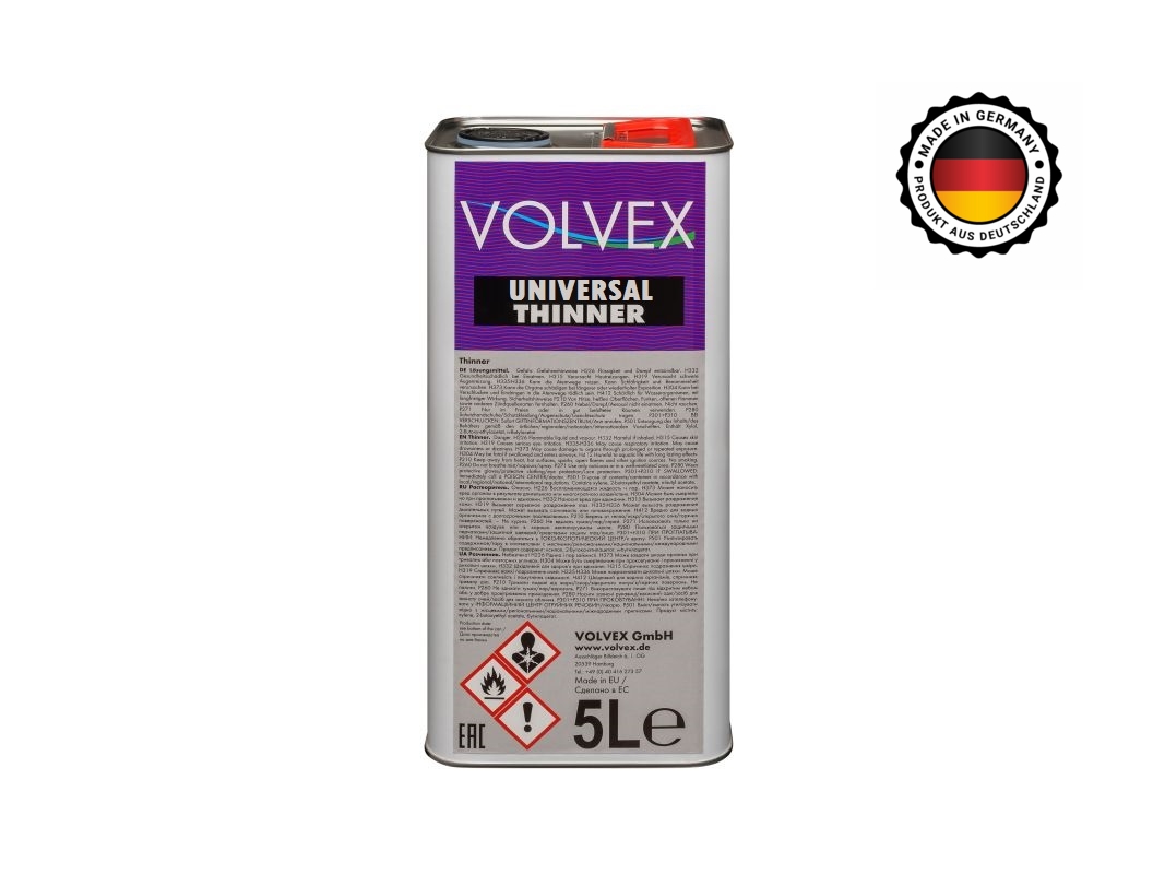 Volvex Thinner Universal растворитель универсальный 5л - это смесь органических разбавителей, предназначенных для разбавления всех типов акриловых красок, лаков, грунтов.