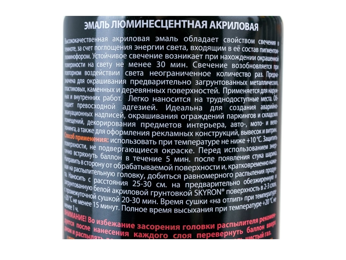 Высококачественная акриловая эмаль обладает свойством свечения в темноте, за счет поглощения энергии света, входящим в её состав пигментом-люминофором. Устойчивое свечение возникает при нахождении окрашенной поверхности на свету не менее 30 мин.