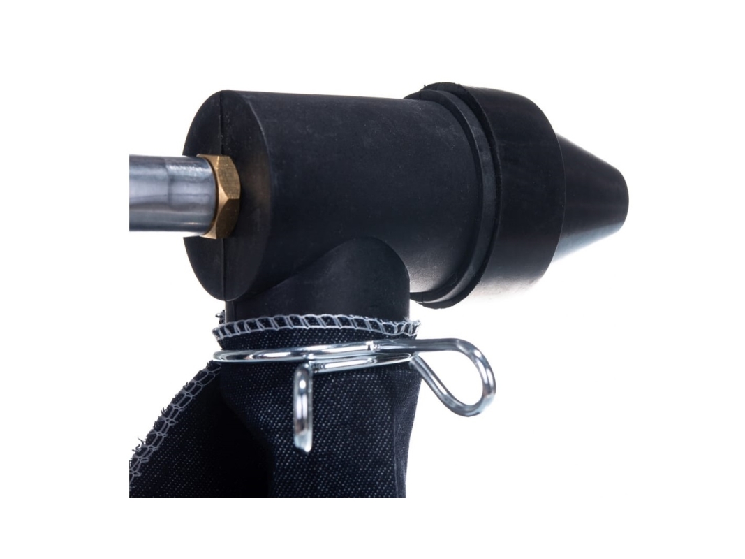 Взятый из мешка и выходящий с большой скоростью абразив после соударения с обрабатываемой поверхностью не разлетается в разные стороны, а блокируется в резиновом колпачке и вместе с выходящим воздухом переносится обратно в мешок с абразивным порошком. Помимо экономии абразива пистолет позволяет проводить обработку «жучков» на ровных и большинстве фасонных поверхностей без применения закрытой спецодежды, которая обязательно требуется при работе с другими видами пескоструйного оборудования. В большинстве случаев достаточно защитных очков, перчаток и респиратора.