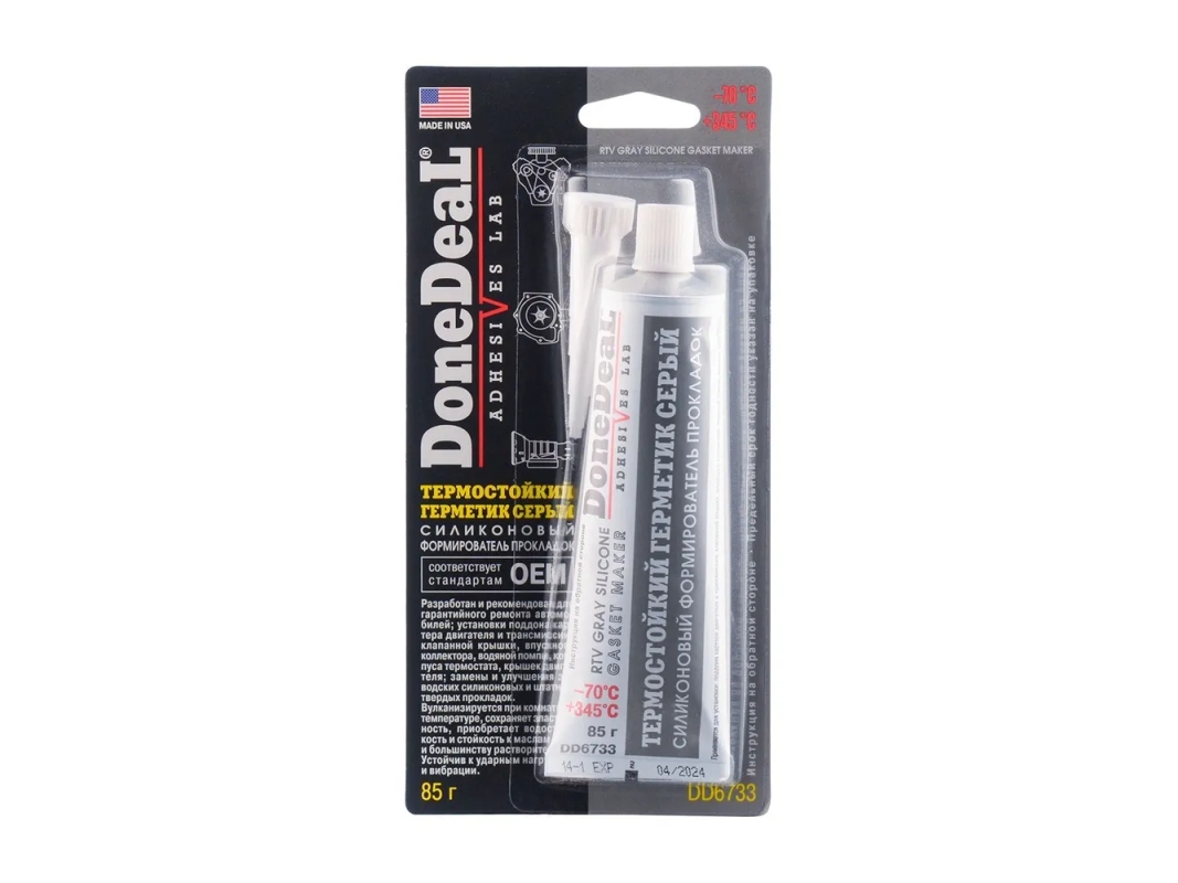 Термостойкий серый силиконовый формирователь прокладок DONEDEAL GRAY RTV DD6733. Отличается относительно невысокой вязкостью и повышенной водостойкостью. Рекомендован для гарантийного ремонта корейских и японских автомобилей.